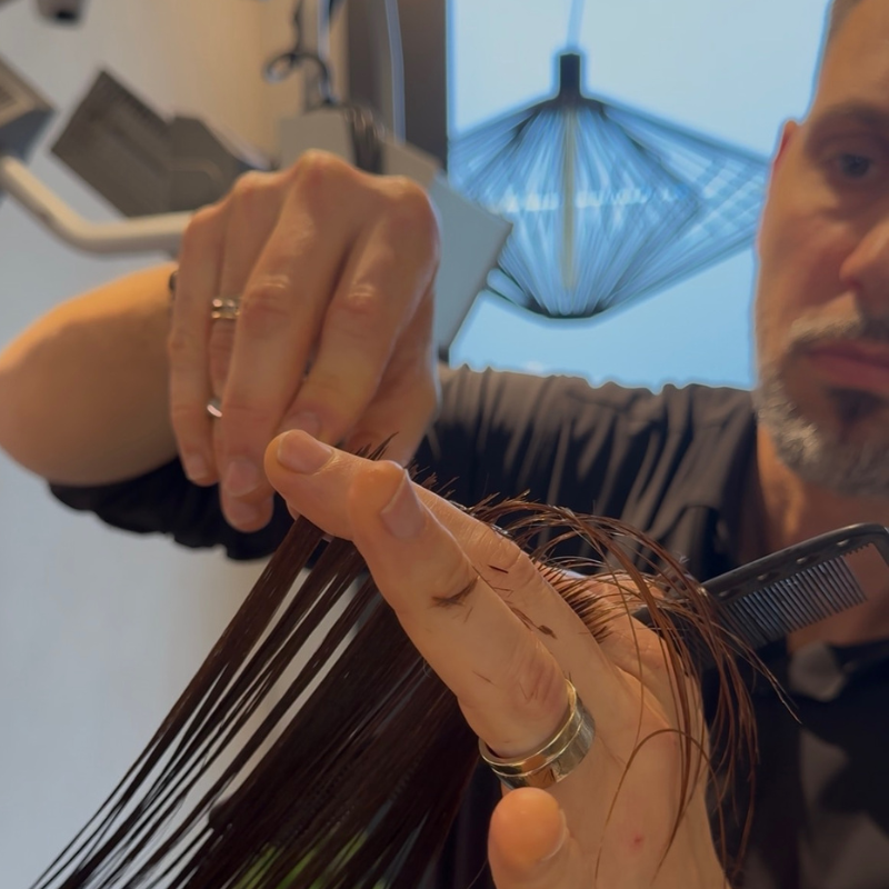Taglio tecnico con studio dei volumi e delle proporzioni, ispirato alle tendenze attuali. Include consulenza personalizzata su styling e prodotti di finitura.